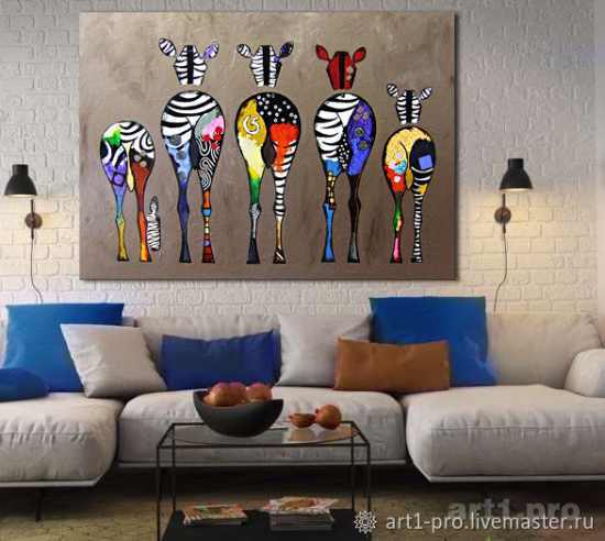 ИНТЕРЬЕРНЫЕ БОЛЬШИЕ КАРТИНЫ МАСЛОМ НА ЗАКАЗ. 🎨 Картина для интерьера Большая 90 на 70 см. интерьерная картина: "Веселые Зебры". Картины современные, яркие и живописные. Достойно украсят любой интерьер. А благодаря большому размеру, очень эффектные! Над каждой картиной работает творческое объединение профессиональных художников-это позволяет добиваться потрясающего результата! Натуральный холст на подрамнике. Масляные краски. Галерейная натяжка. Картину аккуратно упаковываем в пузырчатую пленку и помещаем в коробку для сохранности при транспортировке. Добавьте в интерьер своей квартиры или дома яркий незабываемый превосходный элемент - живописную картину! Бесплатная доставка до транспортной компании! WhatsApp Тел.: 8(918) 9780000