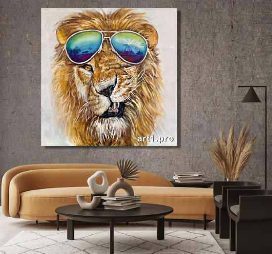 ИНТЕРЬЕРНЫЕ БОЛЬШИЕ КАРТИНЫ МАСЛОМ НА ЗАКАЗ. 🎨 Картина для интерьера Большая 100 на 100 см. интерьерная картина: "Лев в Очках". Картины современные, яркие и живописные. Достойно украсят любой интерьер. А благодаря большому размеру, очень эффектные! Над каждой картиной работает творческое объединение профессиональных художников-это позволяет добиваться потрясающего результата! Выполним в любых размерах до 2-х метров. Перед отправкой делаем фото готовой работы и отправляем Заказчику для одобрения. Натуральный холст на подрамнике. Масляные краски. Галерейная натяжка. Картину аккуратно упаковываем в пузырчатую пленку и помещаем в коробку для сохранности при транспортировке. Добавьте в интерьер своей квартиры или дома яркий незабываемый превосходный элемент - живописную картину! Бесплатная доставка до транспортной компании! WhatsApp Тел.: 8(918) 9780000