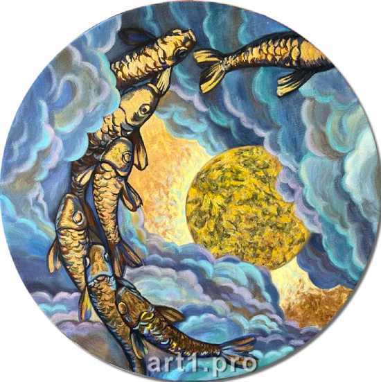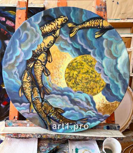 ИНТЕРЬЕРНЫЕ БОЛЬШИЕ КАРТИНЫ МАСЛОМ В НАЛИЧИИ. 🎨 Картина для интерьера d=100 см. Интерьерная картина: "Золотые Карпы Кои в Лунную Ночь". Картины современные, яркие и живописные. Достойно украсят любой интерьер. А благодаря большому размеру, очень эффектные! Над каждой картиной работает творческое объединение профессиональных художников-это позволяет добиваться потрясающего результата! Натуральный холст на подрамнике. Масляные краски. Галерейная натяжка. Картину аккуратно упаковываем в пузырчатую пленку и помещаем в коробку для сохранности при транспортировке. Добавьте в интерьер своей квартиры или дома яркий незабываемый превосходный элемент - живописную картину! Бесплатная доставка до транспортной компании! WhatsApp Тел.: 8(918) 9780000