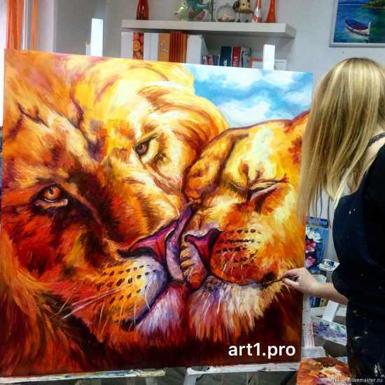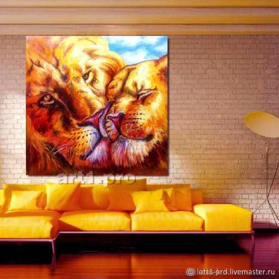 ИНТЕРЬЕРНЫЕ БОЛЬШИЕ КАРТИНЫ МАСЛОМ НА ЗАКАЗ. 🎨 Картина для интерьера Большая 100 на 100 см. интерьерная картина: "Лев и Львица". Картины современные, яркие и живописные. Достойно украсят любой интерьер. А благодаря большому размеру, очень эффектные! Над каждой картиной работает творческое объединение профессиональных художников-это позволяет добиваться потрясающего результата! Выполним в любых размерах до 3-х метров. Предоплата 1тыс. руб. Перед отправкой делаем фото готовой работы и отправляем Заказчику для одобрения. Натуральный холст на подрамнике. Масляные краски. Галерейная натяжка. Картину аккуратно упаковываем в пузырчатую пленку и помещаем в коробку для сохранности при транспортировке. Добавьте в интерьер своей квартиры или дома яркий незабываемый превосходный элемент - живописную картину! Бесплатная доставка до транспортной компании! Тел.: 8(918) 9780000