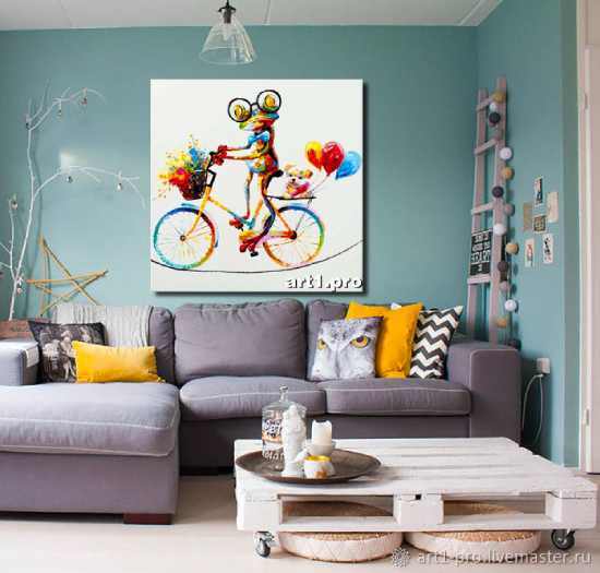 ИНТЕРЬЕРНЫЕ БОЛЬШИЕ КАРТИНЫ МАСЛОМ В НАЛИЧИИ. 🎨 Картина для интерьера Большая 100 на 100 см. интерьерная картина: "Лягушка на Велосипеде". Картины современные, яркие и живописные. Достойно украсят любой интерьер. А благодаря большому размеру, очень эффектные! Над каждой картиной работает творческое объединение профессиональных художников-это позволяет добиваться потрясающего результата! Натуральный холст на подрамнике. Масляные краски. Галерейная натяжка. Картину аккуратно упаковываем в пузырчатую пленку и помещаем в коробку для сохранности при транспортировке. Добавьте в интерьер своей квартиры или дома яркий незабываемый превосходный элемент - живописную картину! Бесплатная доставка до транспортной компании! WhatsApp Тел.: 8(918) 9780000