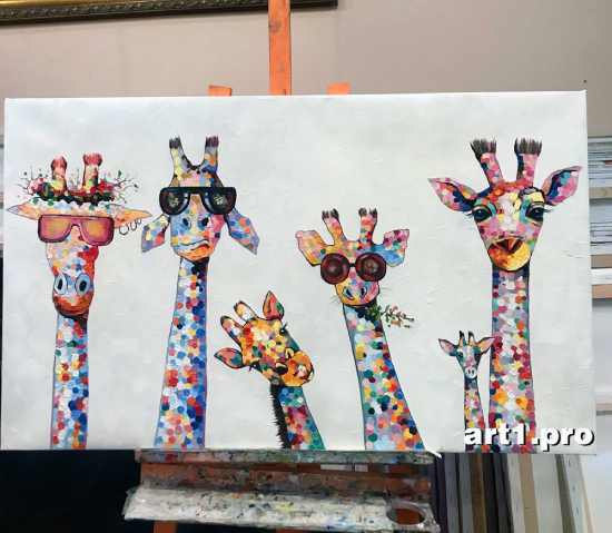 ИНТЕРЬЕРНЫЕ БОЛЬШИЕ КАРТИНЫ МАСЛОМ НА ЗАКАЗ. 🎨 Картина для интерьера Большая 120 на 70 см. интерьерная картина: "Веселые Жирафики". Картины современные, яркие и живописные. Достойно украсят любой интерьер. А благодаря большому размеру, очень эффектные! Над каждой картиной работает творческое объединение профессиональных художников-это позволяет добиваться потрясающего результата! Выполним в любых размерах до 2-х метров. Предоплата 2тыс. руб. Перед отправкой делаем фото готовой работы и отправляем Заказчику для одобрения. Натуральный холст на подрамнике. Масляные краски. Галерейная натяжка. Картину аккуратно упаковываем в пузырчатую пленку и помещаем в коробку для сохранности при транспортировке. Добавьте в интерьер своей квартиры или дома яркий незабываемый превосходный элемент - живописную картину! Бесплатная доставка до транспортной компании! Тел.: 8(918) 9780000